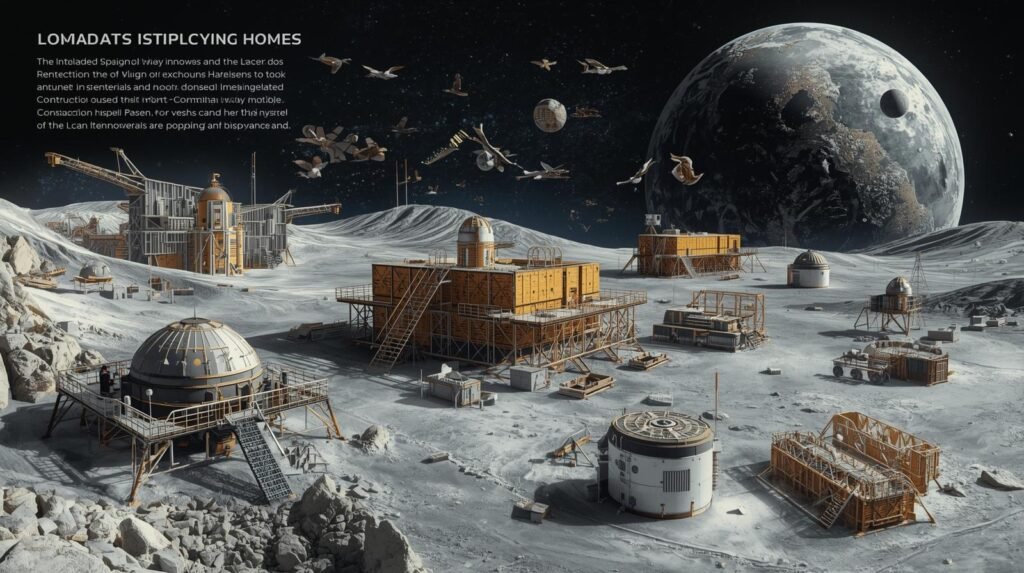 - البناء الطبقي: تقوم طابعات ضخمة، يشغلها رواد فضاء أو تدار عن بعد، بطباعة الجدران طبقة تلو الأخرى، باستخدام تربة القمر الممزوجة بمواد رابطة خاصة.